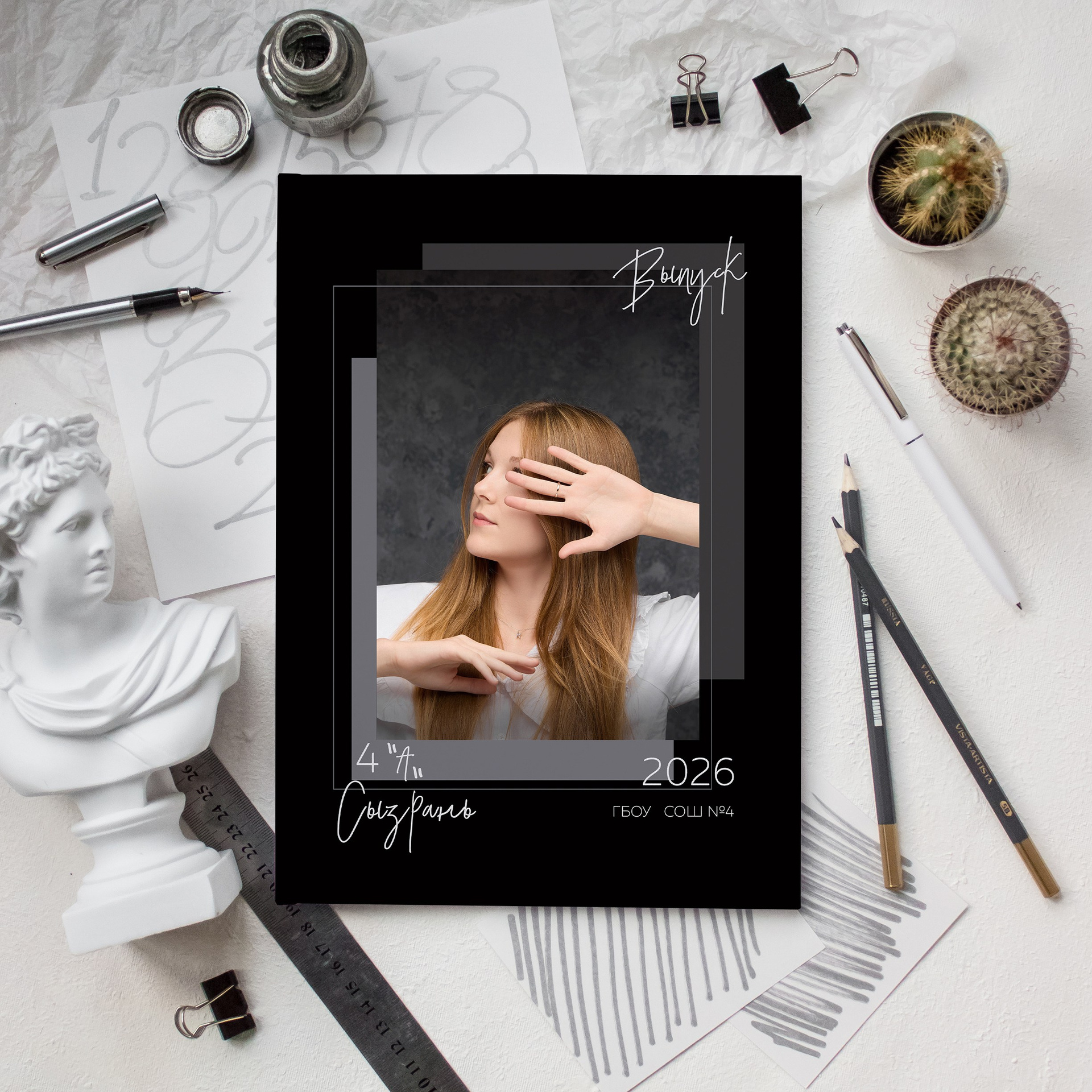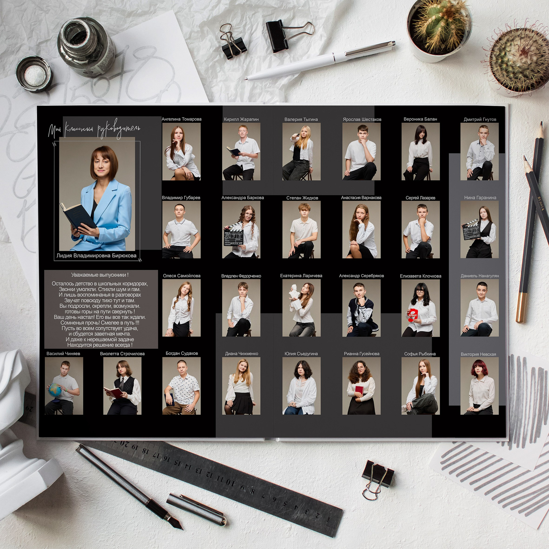 - возможность оформления до 10 индивидуальных разворотов по желанию — общее фото, фото с друзьями, портреты в разных локациях нашей студии, фото с учителем
