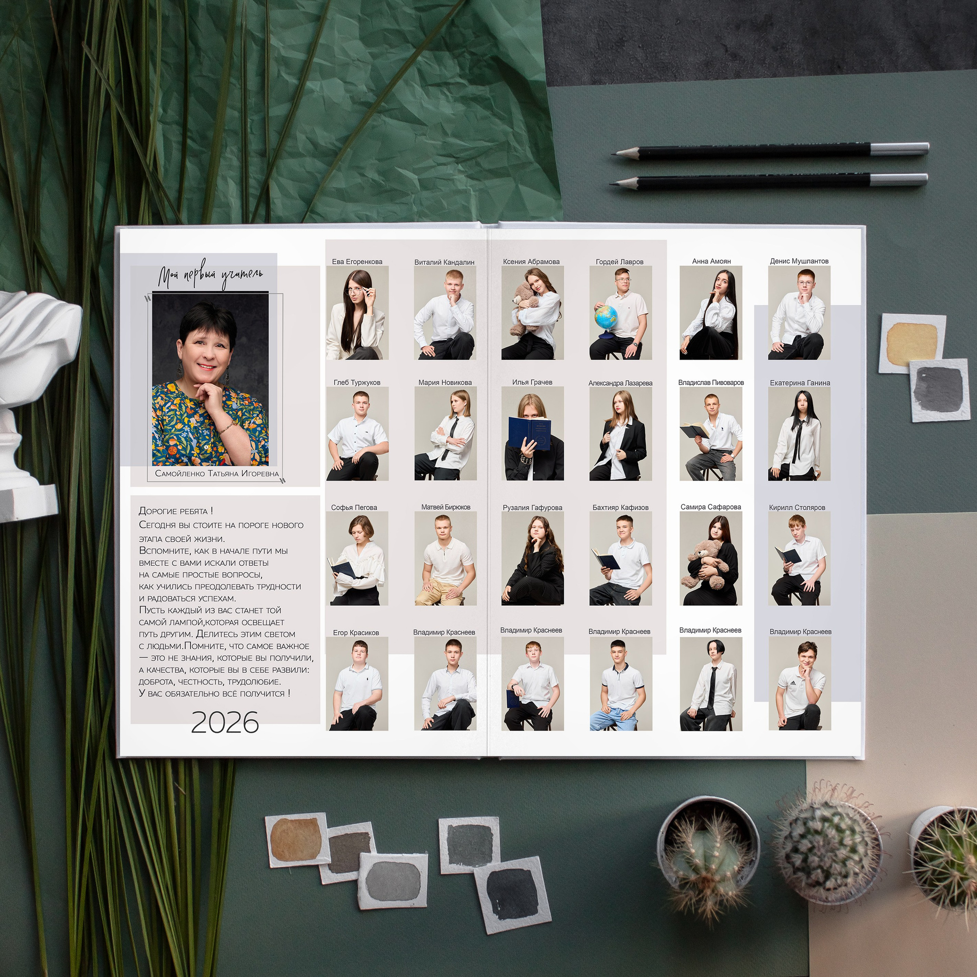 - в базовый вариант входит персональная обложка с портретом и один разворот с портретами учеников и учителя с именами (виньетка)